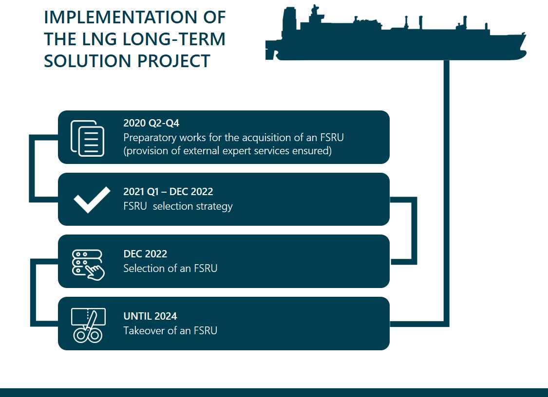 Under the Law on Liquefied Natural Gas, KN is obliged to acquire and operate a floating LNG storage and regasification unit (FSRU) by December 31, 2024 at the latest, i.e. to become the owner of the whole infrastructure and superstructure. The company must choose the most economically advantageous offer and ensure reliable operation of the LNG terminal by 2044. In order to achieve these goals, the missing competencies will be used to develop strategies and contracts for the acquisition and management of FSRU maintenance services. Various alternatives will be considered with the help of external experts, including (but not limited to) the acquisition of the existing FSRU “Independence”.
