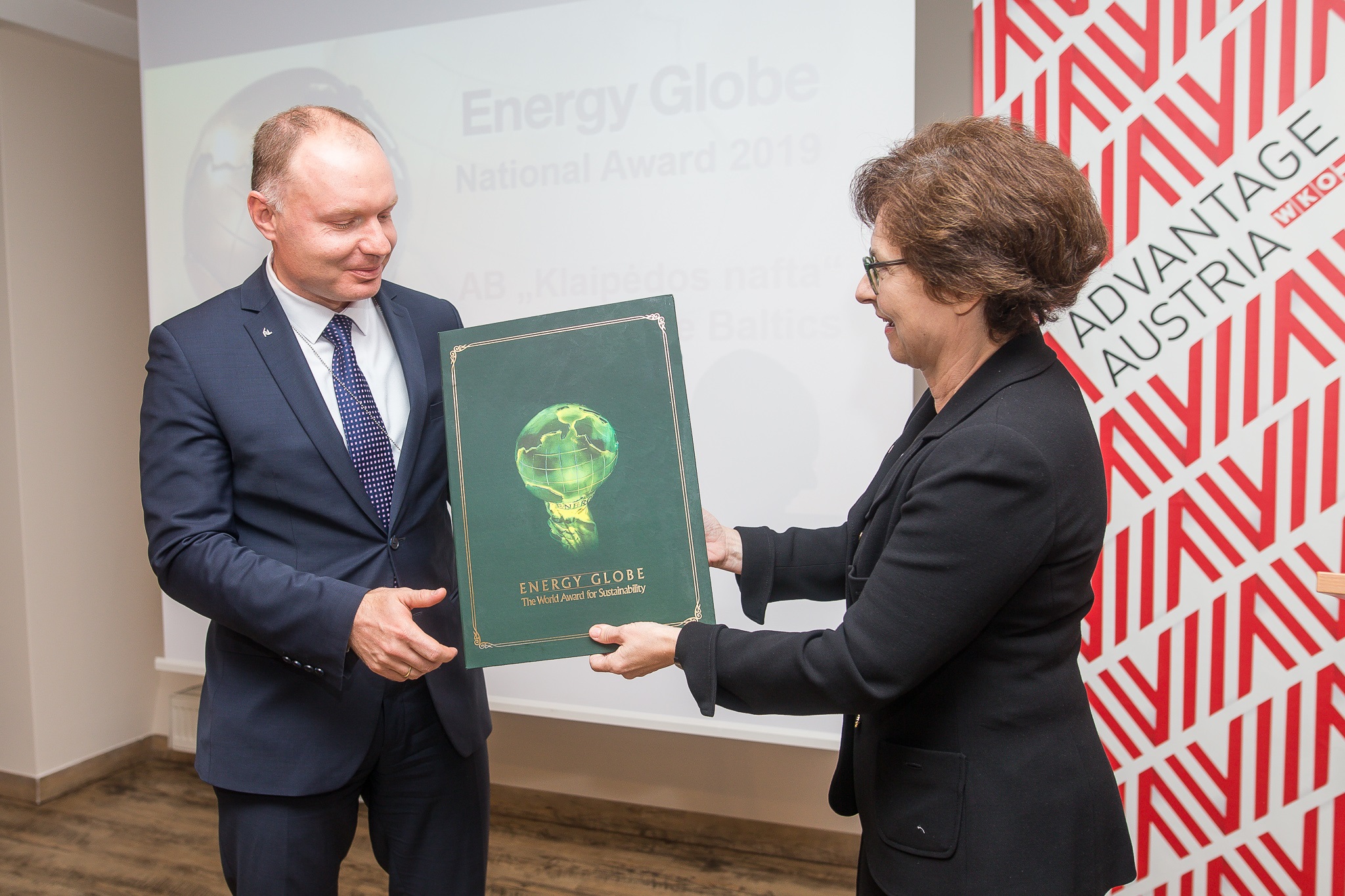 Ingrid Valentini-Wanka, Economic Advisor at the Austrian Embassy, awards Energy Globe Award Lithuania 2019 certificate to Arūnas Molis, Director of KN Klaipėda LNG service.