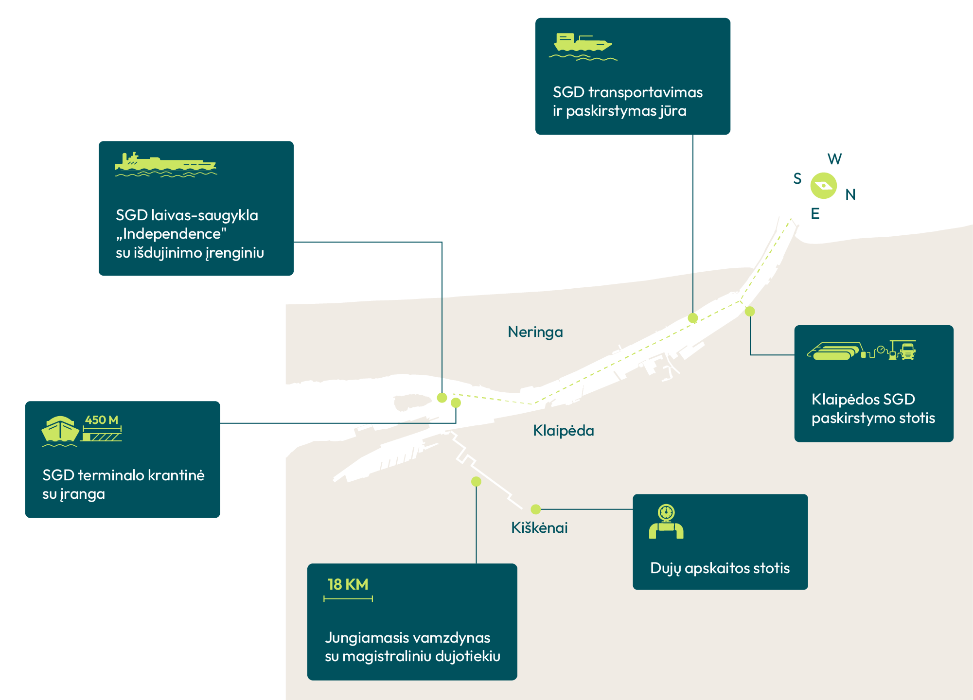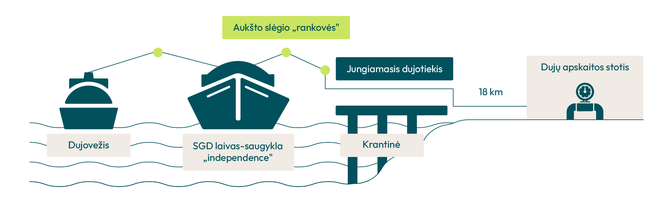 • 18 km ilgio (iš jų 3 km po Kuršių mariomis) 700 milimetrų skersmens aukšto slėgio jungiamasis dujotiekis, jungiantis laivą saugyklą su dujų apskaitos ir skirstymo stotimi Kiškėnuose.